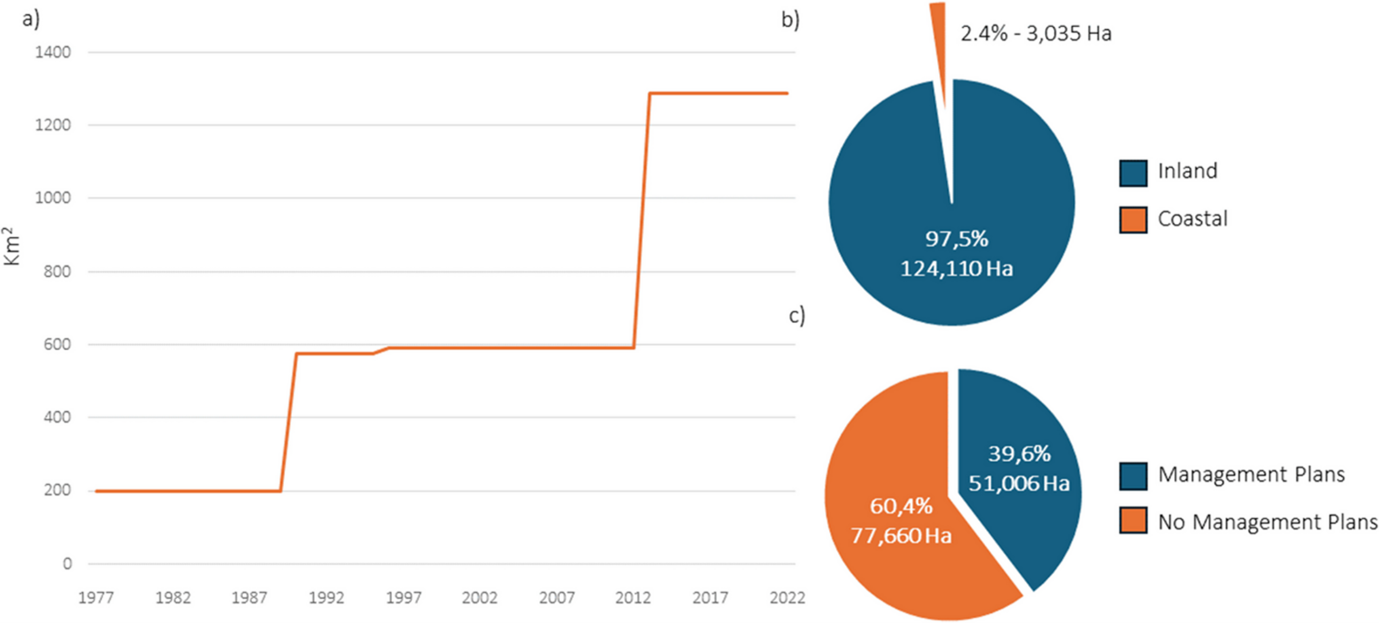 b) Extent of Marine or coastal wetlands versus Inland waters in Ramsar sites