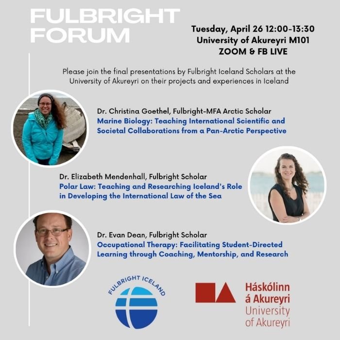 Three US Fulbright scholars who are ending their Fulbright grant period at the University of Akureyri will present their projects and discuss their experiences in Iceland. The event will take place on Tuesday 26 April from 12:00 to 13:30 at the University of Akureyri, room M101. All are welcome to attend. The event will also be live-streamed on Zoom and FB Live. Refreshments will be provided.