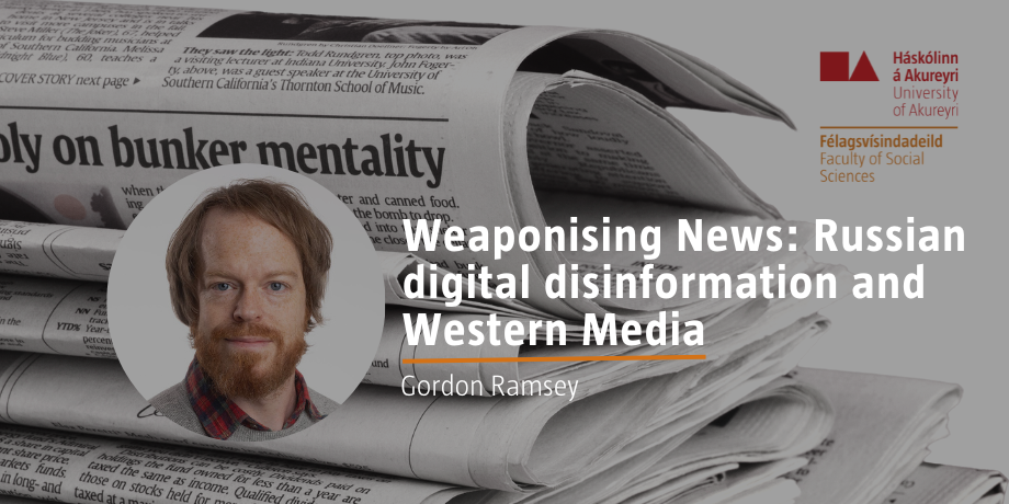 Gordon Neil Ramsay is Associate Professor at the University of Akureyri and teaches on the BA Media Studies programme. His work focuses on media policy and regulation, disinformation, and the nature and effects of the decline of local journalism. His book (co-authored with Professor Sarah Oates), Seeing Red: Russian Propaganda and American News will be published in 2024 by Oxford University Press.