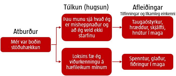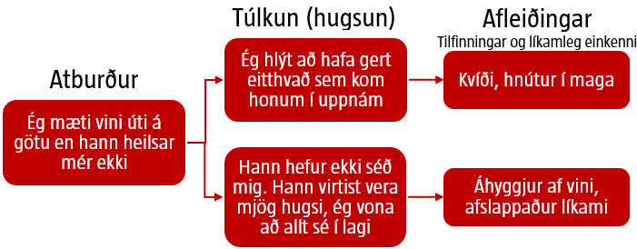 Í fyrri túlkuninni gerir einstaklingurinn ráð fyrir því að eitthvað hafi komið fyrir og að það sé honum að kenna, og það leiðir til kvíða. Síðari túlkunin er yfirvegaðri og leiðir til annarrar niðurstöðu. Skoðum annað dæmi: