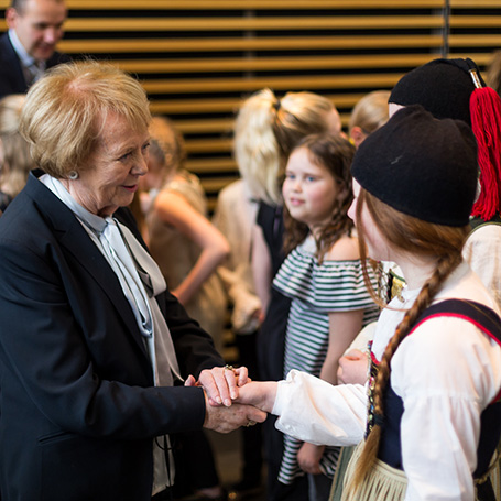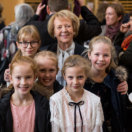 Vigdís tekur í hendina á tveimur stúlkum í þjóðbúningum Vigdís tekur utan um hóp stúlkna Mynd frá því að Vigdís flutti eftirminnilegri ræðu í tilefni heiðursnafnbótarinnar Uppstillt falleg mynd frá því Vigíds var sæmd heiðursnafnbót háskólans
