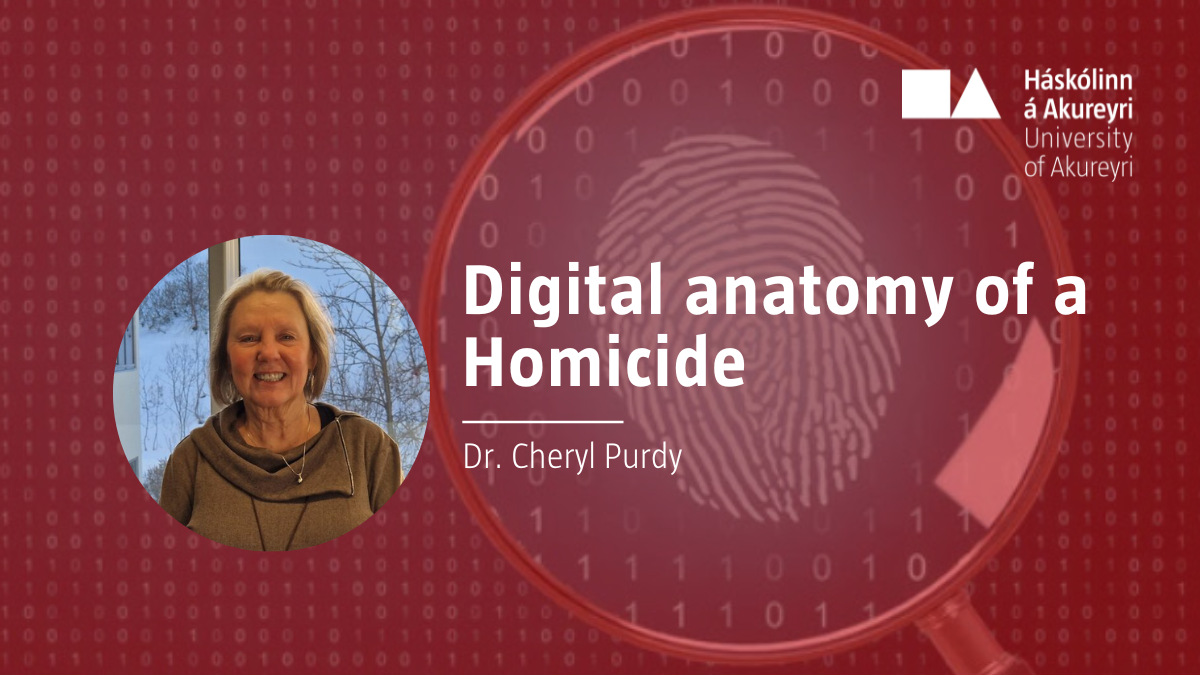 Miðvikudaginn 28. febrúar kl. 12:15 mun Dr. Cheryl Purdy frá Cumberlands háskóla og Vestur Kentucky háskóla halda hádegisfyrirlestur á vegum Rannsóknaseturs í lögreglufræði við HA um stafræna rannsókn á raunverulegu morðmáli (e. digital amatomy of a homicide).