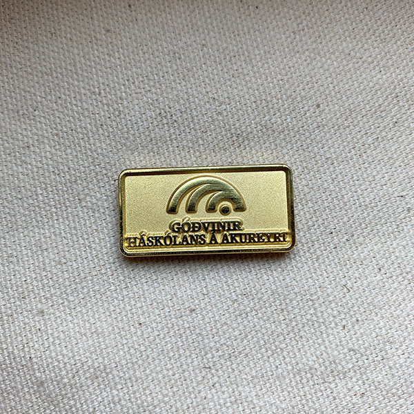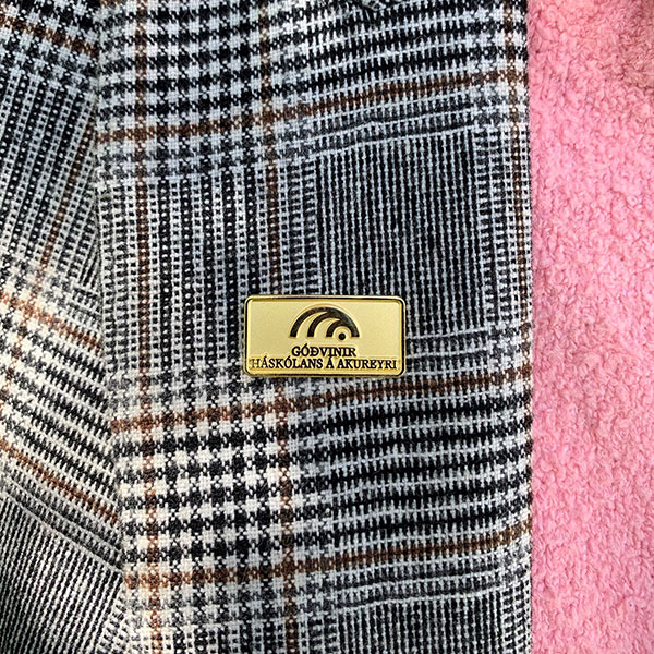 Barmmerki Góðvina Háskólans á Akureyri. Merkið er fest á klæðnað með segli.